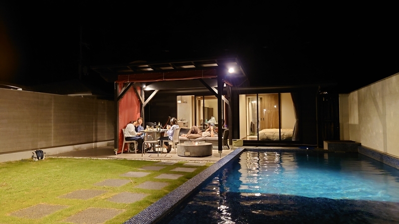 庭が広いのでバトミントンをするのですが、隣のスペースに飛んでいきそうやらジャグジーの屋根にのせるやらで早々に終了。